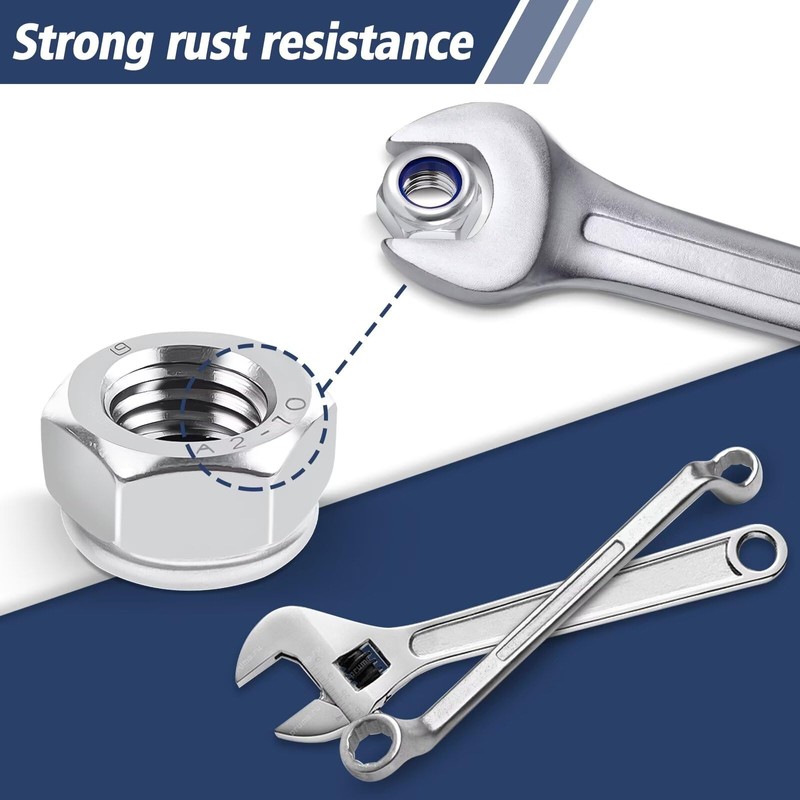 - 【Easy to use】 The stainless steel nylon insert lock nut easy to install can be easily installed in the tightest space.Torque wrenches and screwdrivers are enough to tighten the locking stop nuts, it can be dismantled and used at any time.
