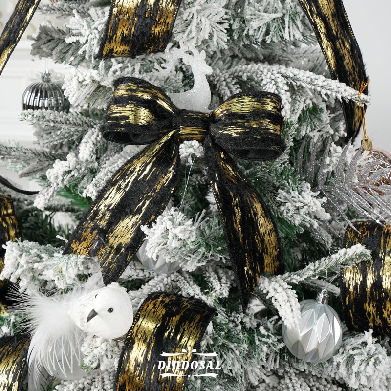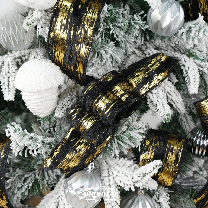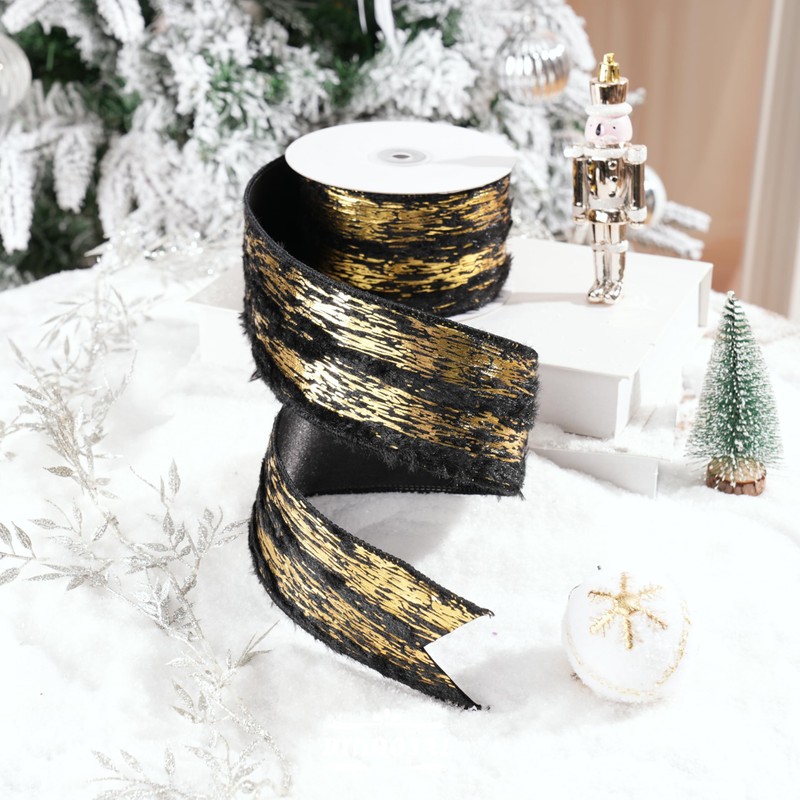 - MATERIAL: The black and gold wired Christmas tree ribbon ,combines the golden fleece with birch bark pattern , add this beautiful ribbon to any arrangement, holiday tree, or as a stylish accent to your gift wrapping projects.This brich bark ribbon is made of polyester and features a thick wired edge that allows bending and shaping for easy decorating.