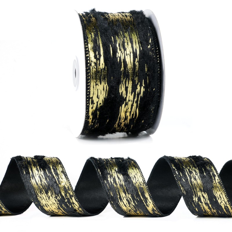 - APPLICATION: The blac and gold wired Christmas ribbon with gold birch bark bring a great flair to your christmas decorations. The cuddlys soft faux fur is perfect for processing of material in folral wreaths or arrangements and other crafts,vases, flower pots,lanterns embellished.With a pretty wood or metal pendant you set accents. Adding a touch of luxury and elegance to your holiday decorations, gift wrapping, plush, eye-catching present bows, garlands, table settings,door swags, staircases,mailbox and more.