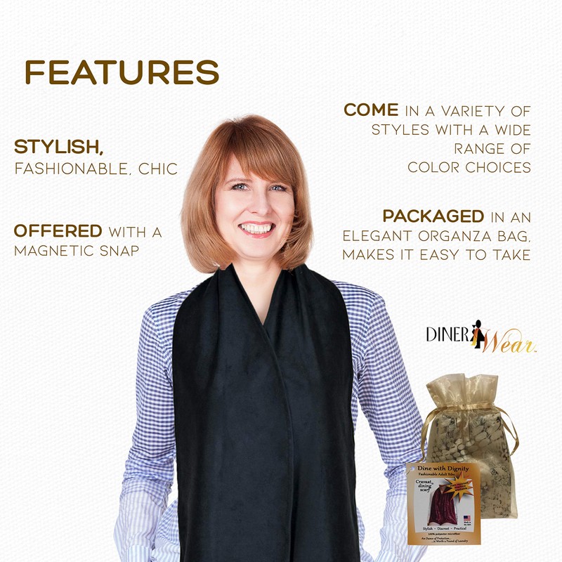 - Cozy Dining Minus the Stains - Enjoy your meals with our stylish dining scarf bibs that you will be proud to wear in a nice restaurant. Available in 14 inches wide & 21" wide x 34 inches long, our stylish clothing protectors will keep your clothes stain-free for a neat dining experience at every meal.