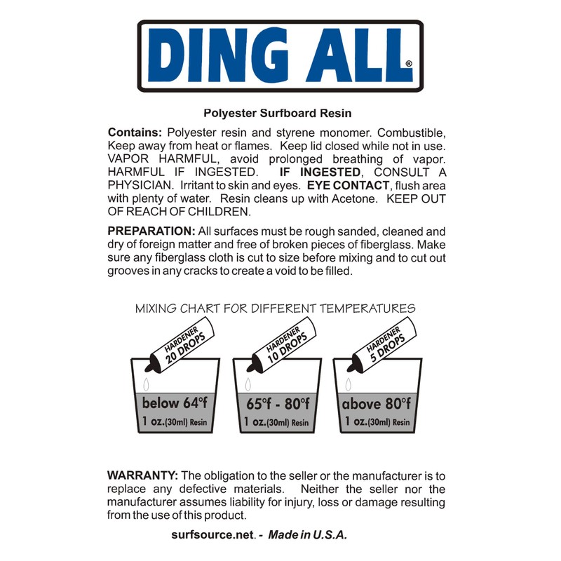 - USED BY PROFESSIONALS: Used by 80% of all US board builders Ding All Sanding Resin comes in 3 sizes 8-ounces, quart and gallon and is MADE IN THE USA