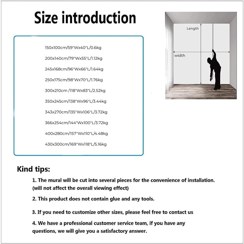 Home is where you spend most of your day and where you relax.Our murals with shiny patterns and beautiful designs will help you enter a new world in a short time and fill your home with colorFeature: This Mural Is Made Of High-Quality Pvc, With Good Gloss Decoration wallpaper HD print perfectly recreate the look and feel of the original image, make you immersive and imaginative, let go of the tiredness of the day Relatively Simple And Convenient To Use Peel And Stick, Easy To Apply, Removable Self-Adhesive Wallpaper, Doesn'T Damage Wall Surface Art decor wall mural can be used for wall renovation, renters decoration, new house decoration etc. A perfect gifts for your family, friends and colleaguesSize&Weight:150x100cm/59"Wx40"L/0.6kg200x140cm/79"Wx55"L/1.12kg245x168cm/96"Wx66"L/1.64kg250x175cm/98"Wx70"L/1.76kg300x210cm /118"Wx83"L/2.52kg350x245cm/138"Wx96"L/3.44kg343x270cm/135"Wx106"L/3.72kg366x254cm/144"Wx100"L/3.72kg400x280cm/157"Wx110"L/4.48kg430x300cm/169"Wx118"L/4.48kgInstallation Precautions: Before starting installation, please make sure the wall surface is smooth, clean and dry. To ensure a smooth installation, if there is dust or sand on the surface, remove it, otherwise the mural will not adhere well to the surface and may even fall off after a few days No need to prepare glue in advance. Just peel off the backing paper and stick it to the wall Measure the wall dimensions to ensure you choose the correct size If you have any questions, please feel free to contact us