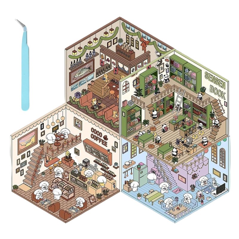 - 3D House Sticker Set: Our 3D sticker scenes With tweezers has 4 themes, Maisonette, coffee shop, Panda Bookstore and restaurant, you have the freedom to rearrange and customize the scene according to your imagination and style.