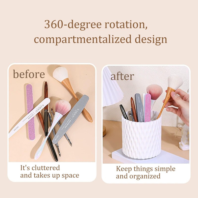 This 360 degree rotating makeup brush storage rack is a multifunctional desktop organizer. The design includes five separate compartments, which can easily accommodate various sizes of cosmetic brushes, eyebrow pens, eyeliner pens, hair ornaments, nail