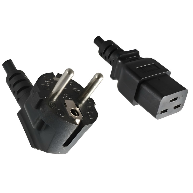 - Power cable CEE 7/7 90° to C19, 1mm², length 1.80 m: Ideal for tight spaces with a 90° angled Schuko plug and a straight C19 plug, perfect for everyday applications.