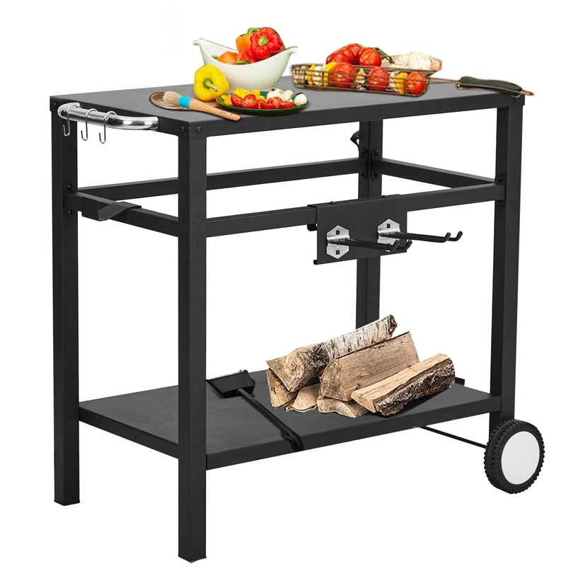 - Ample Storage Space: With a double-shelf construction design and 4 hooks, there is plenty of storage space for your tools, utensils, and ingredients. The dining cart can hold up to 220 lbs and is perfect for holding your grill, pizza oven, or other large appliances.
