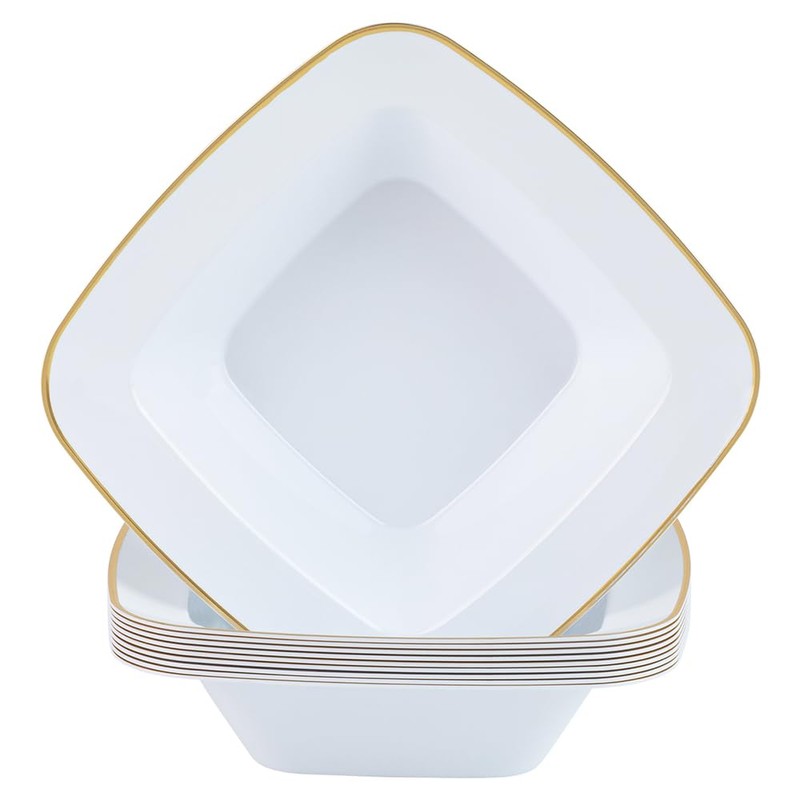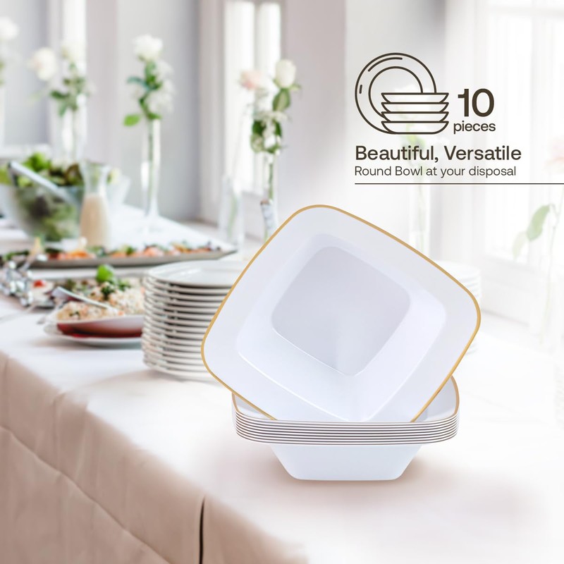 • CLASSIC DESIGN: Each bowl boasts a classic square shape complemented by a luxurious gold rim, bringing a refined look to your table setting, our disposable dinnerware offers both elegance and ease.