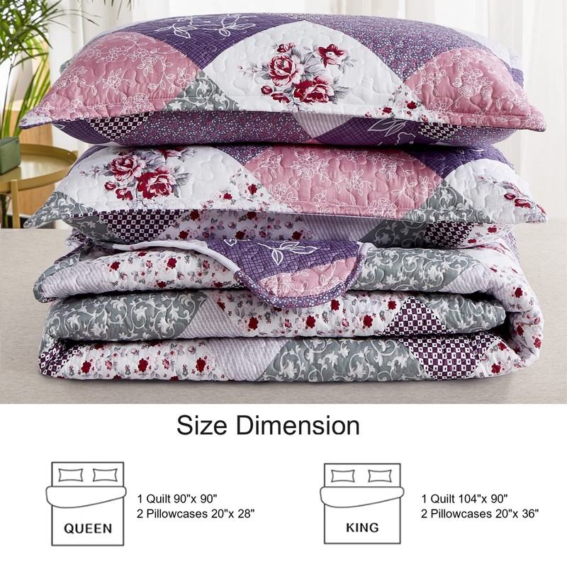 - What You Can Get: Purple lavender patchwork bedding set available in Queen Size: 1 quilt set 90"x90" + 2 pillowcases 20"x28". King Size: 1 quilt set 104"x90" + 2 pillowcases 20"x36".