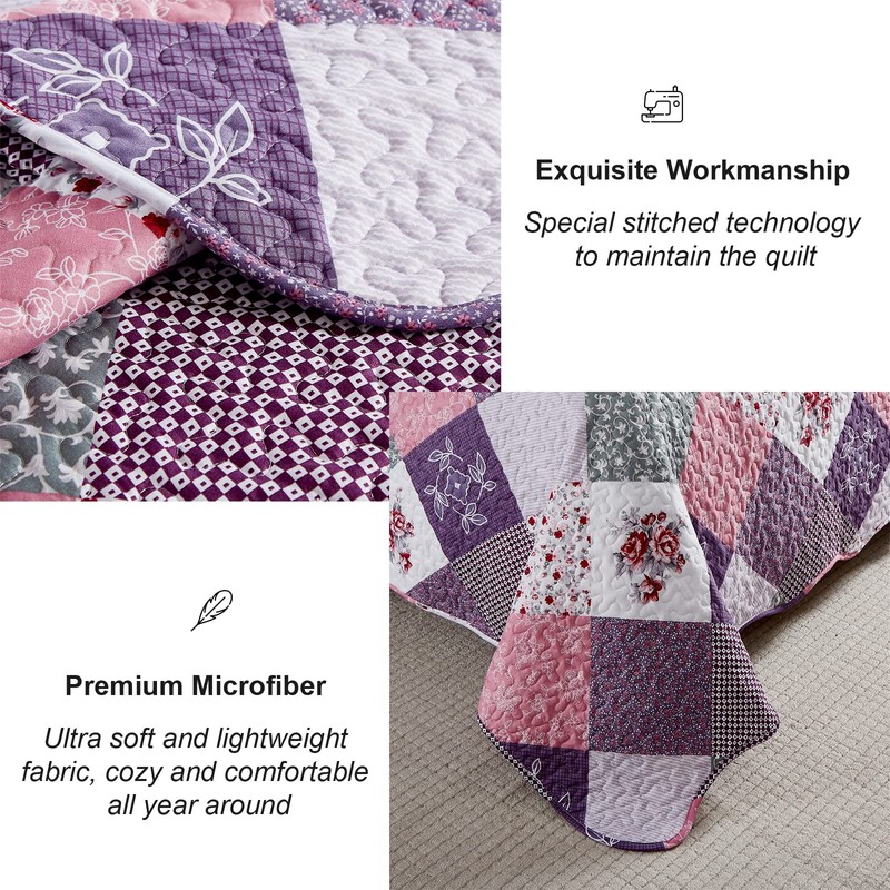 - 3 Layers Purple Bed Set: With special stitched technology to maintain the floral patchwork quilt, you can wash it directly in machine, made of 3 separate layers, you can use it as a quilt in spring and summer, and a bedspread coverlet set in autumn and winter.