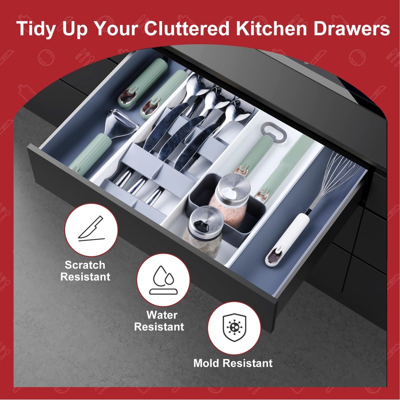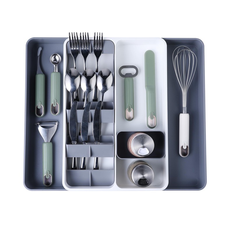 Compared to other utensil holder drawer, the unique hidden expandable panels buckle design makes it easy to use and the whole drawer organizer silverware looks more compact and elegant.