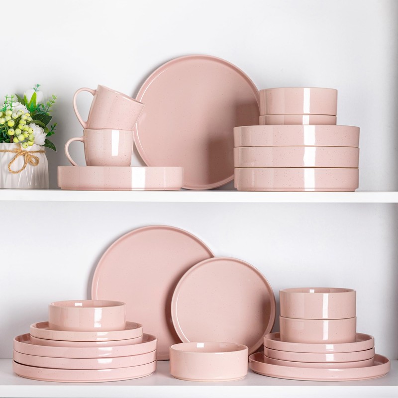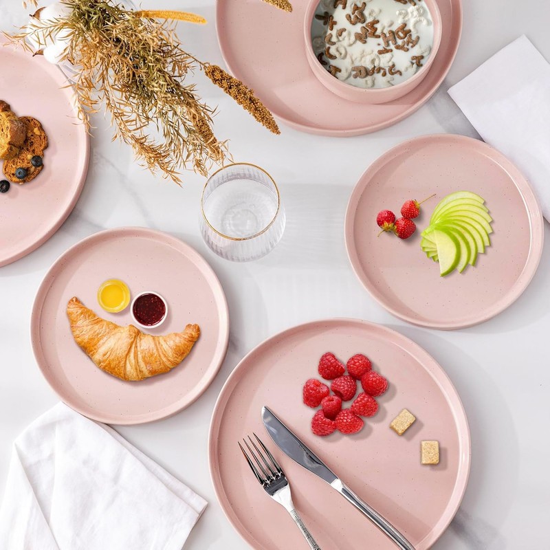 Dinnerware Set for 6, 18 Piece Speckled Plates and Bowls Set with Glazed Bottom, Chip & Scratch Resistant Stoneware Plates Set, Dishwasher & Microwave Safe Dishes Set (Pink, Service for 6)