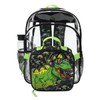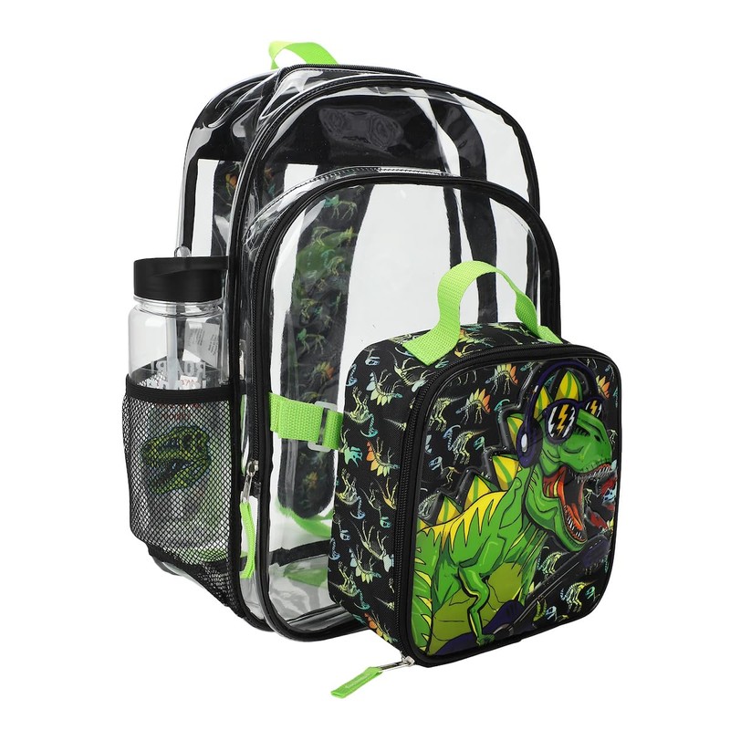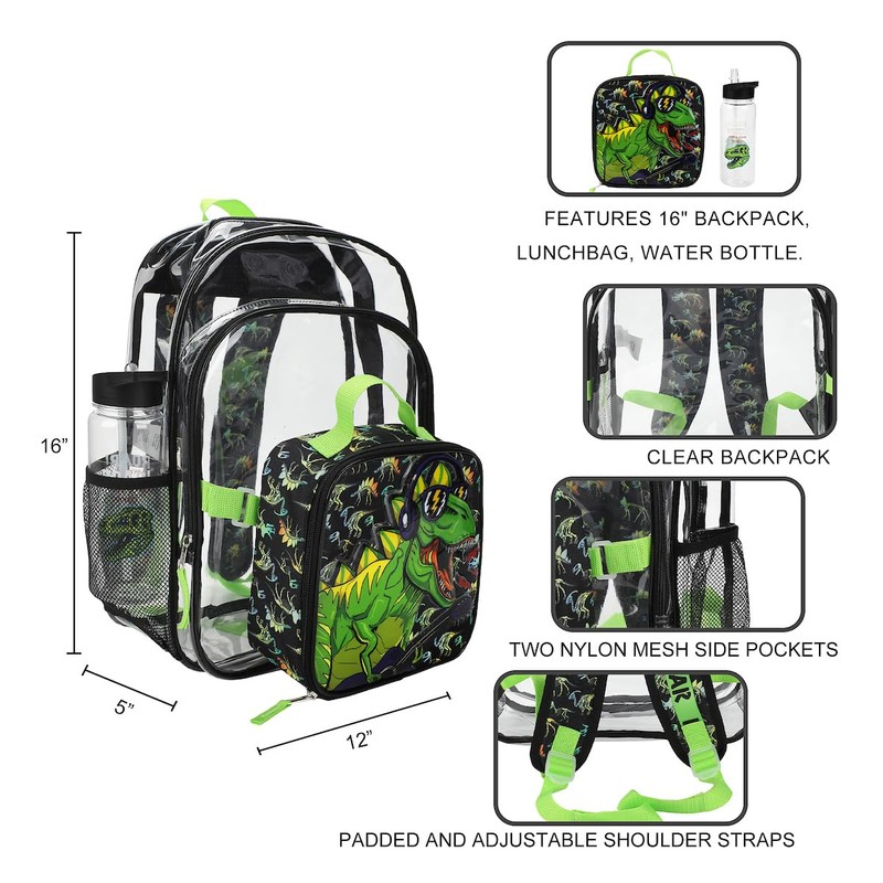 - CLEAR BACKPACK: The 16” backpack has been custom designed with a clear PVC body and adjustable shoulder straps featuring a colorful all-over print of dinosaur fossils. A large front zippered pocket keeps smaller objects within easy reach.