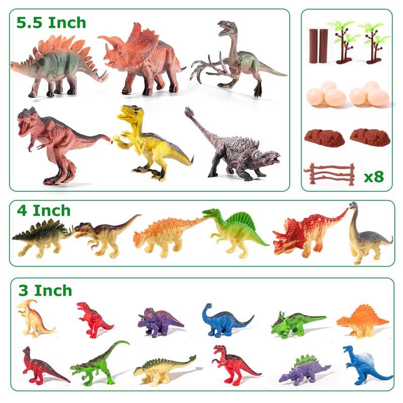 - What You Get - This dinosaur toys includes 6*5.5 inch dinosaur figures,6*4 inch dinosaurs,12*3 inch dinosaur toys,20*eggs,trees and rocks,1*durable storage case.Kids will be attracted quickly by a variety of cute dinosaurs and easy to play.
