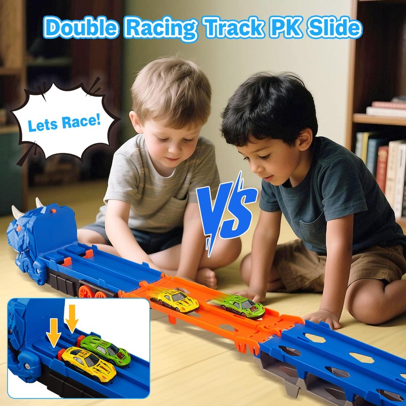 - đăPerfect Gift for KidsăKids will be attracted by the dinosaur transport truck toy set because of cool racing cars, extra-long racing track and swallowing function, which can bring endless fun to kids, encourage competition and interaction between kids, simulate races, develop imagination and creativity, it is a ideal birthday, Christmas, Easter, Easter and other special occasions gift for 3 4 5 6 7 8 years old boys girls.