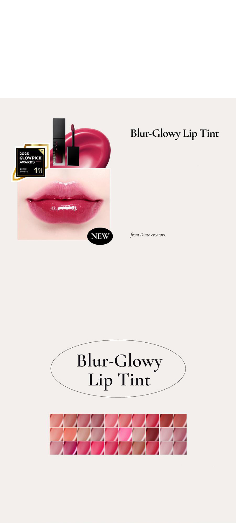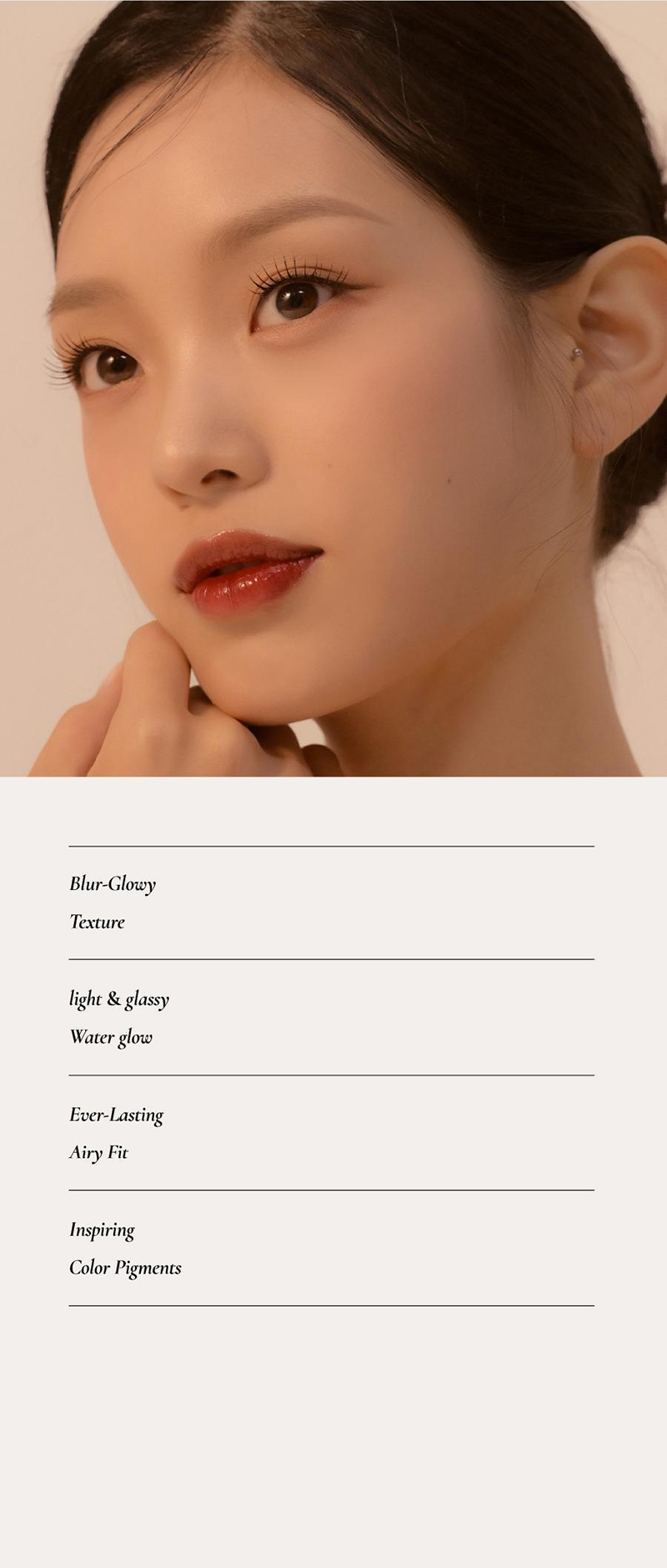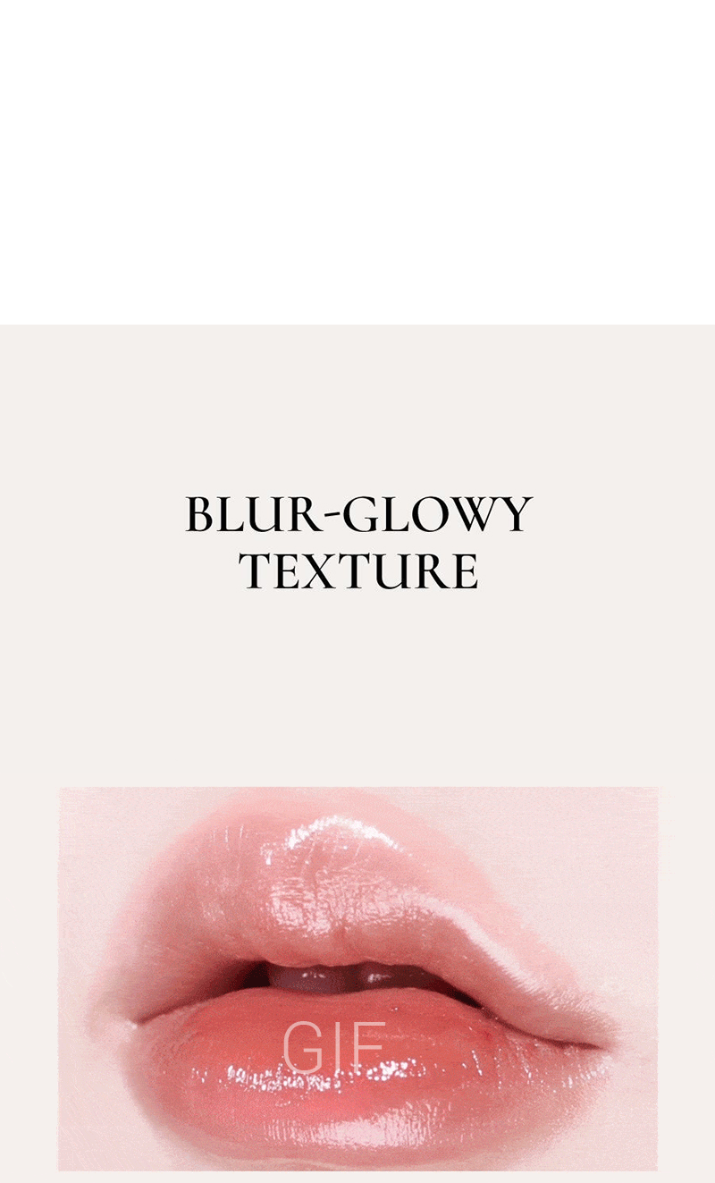 The "WATER TO OIL" formula features moisture-coated oil particles that wrap the skin in a hydrating and color-rich layer. Blur-Glowy Lip Tint’s gloss coating layering formula is designed to provide long-lasting, transfer-proof, comforting wear without making lips dry.