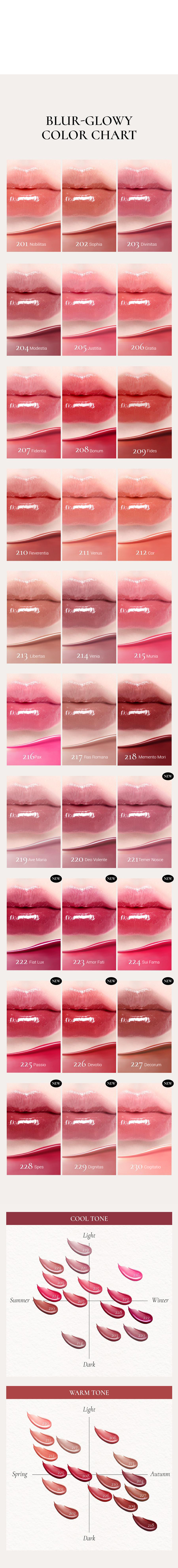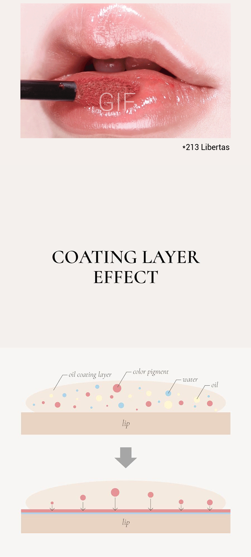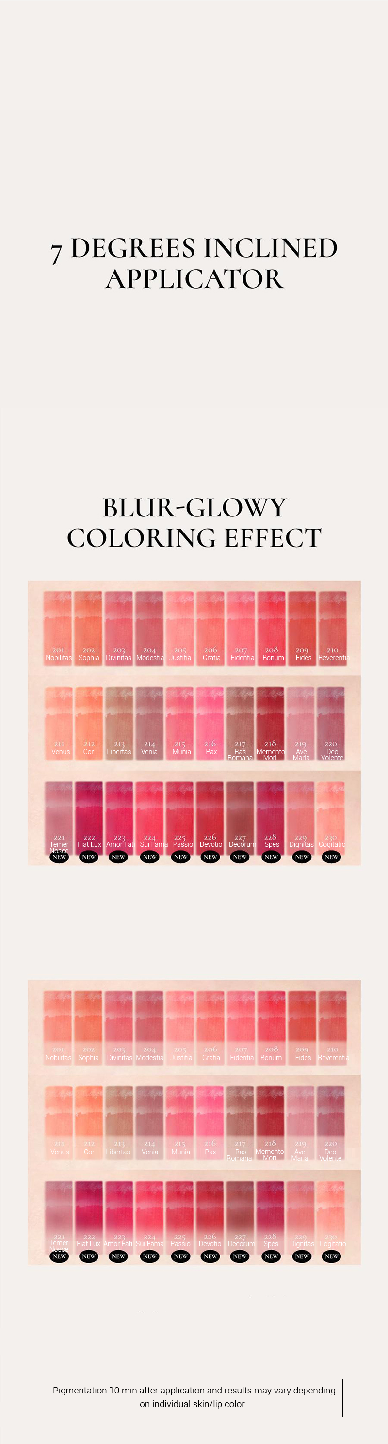 The "WATER TO OIL" formula features moisture-coated oil particles that wrap the skin in a hydrating and color-rich layer. Blur-Glowy Lip Tint’s gloss coating layering formula is designed to provide long-lasting, transfer-proof, comforting wear without making lips dry.