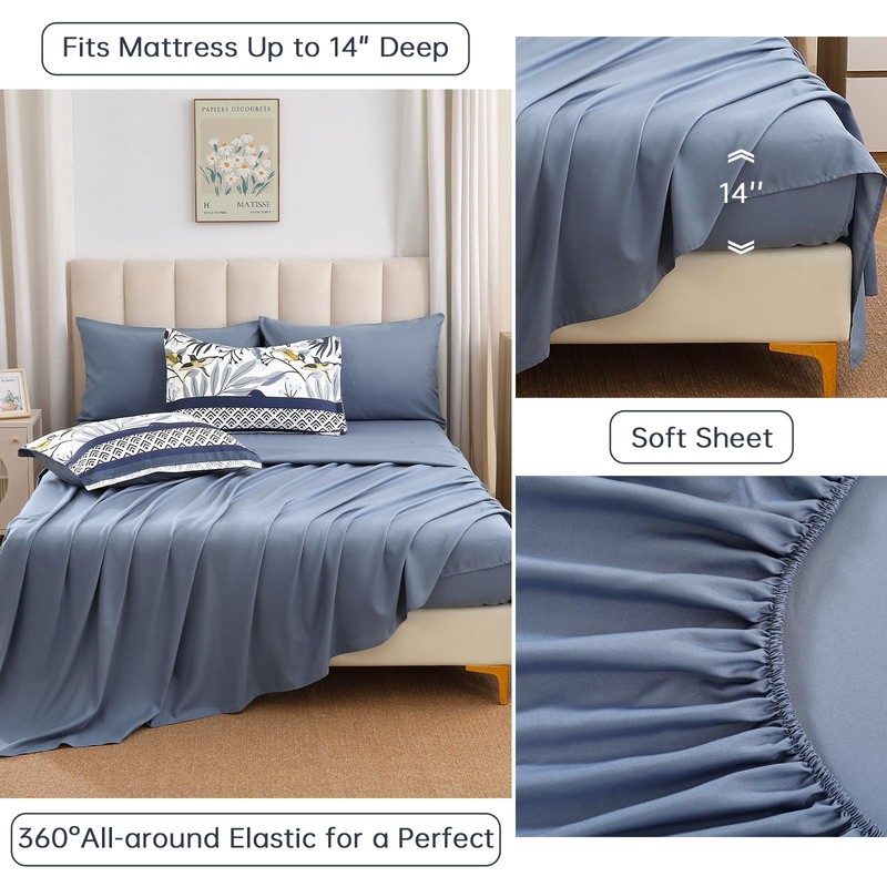 - [7 Pieces Bed in a Bag] This aesthetic birds king bed comforter set include 7 pieces. 1 blue leaves comforter 90" x 103" + 2 pillowcases 36" x 20"+1 Fitted Sheet 78"x 80"+14"+1 Flat Sheet 102"x 108"+2 Pillow Shams 20"x 40". The vivid hummingbird and botanical leaves patterns add vitality and aesthetic vibe to your sleeping space. NOTE: No Pillow Insert Includes.