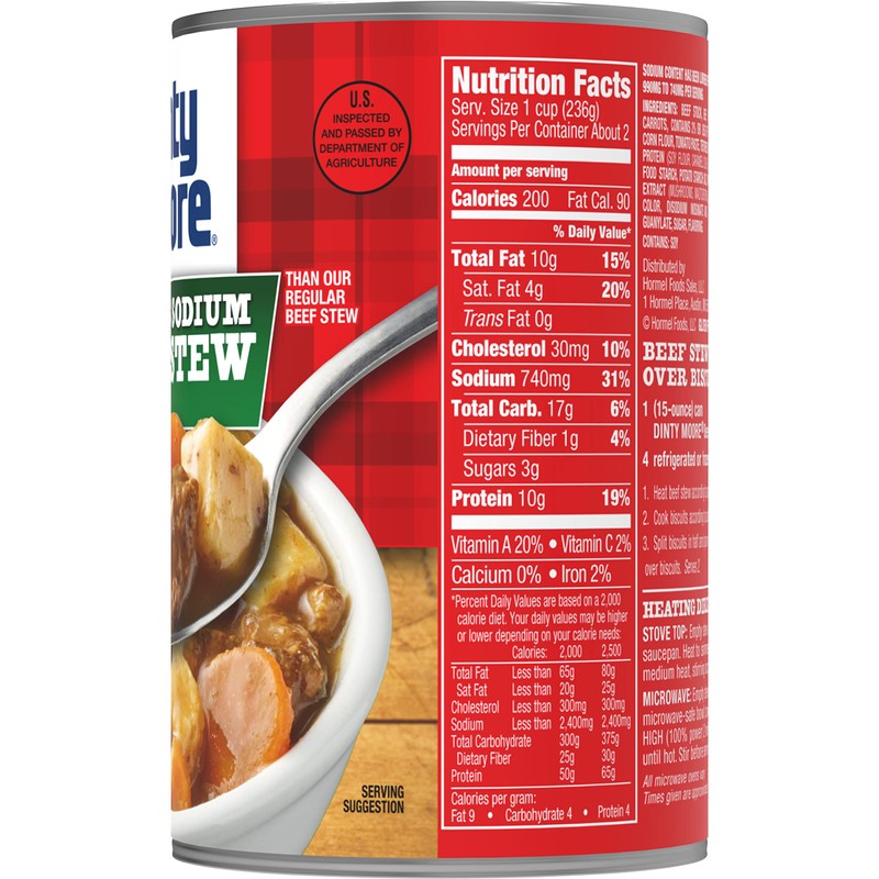 - Includes twelve 15 ounce cans of DINTY MOORE Beef Stew 25%Less Sodium* made with real chunks of beef, potatoes, and carrots *than our regular beef stew