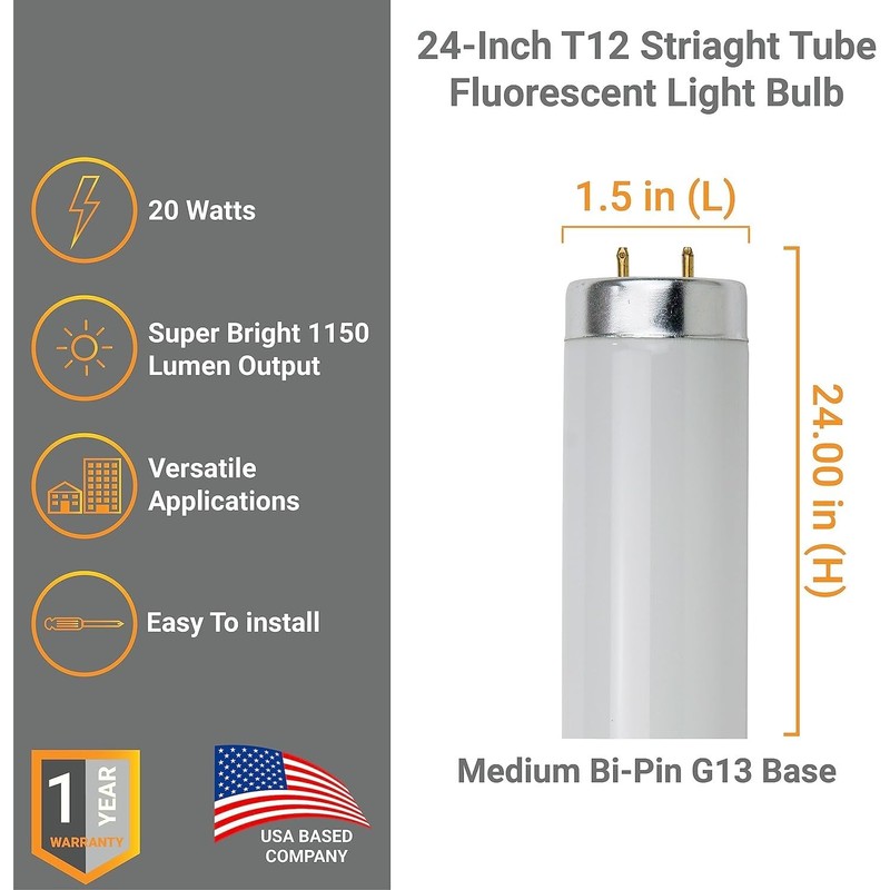 - High Luminous Output for Maximum Brightness - This 24-inch T12 fluorescent tube delivers an impressive 1150 lumens of brightness, making it ideal for a wide range of environments that require consistent and powerful lighting. Whether you're outfitting a workshop, garage, office, or commercial space, the high output ensures excellent visibility and coverage, reducing the need for multiple fixtures.