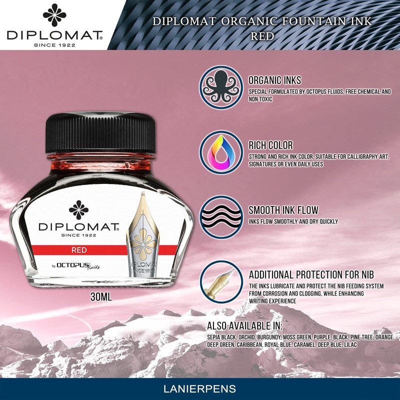 - Discover the Diplomat by Octopus Inks and express your personality and mood. Diplomat 15 beautiful Ink colors are available to create beautiful writing. A new innovation in Diplomat's products is their new 30ml ink bottles.