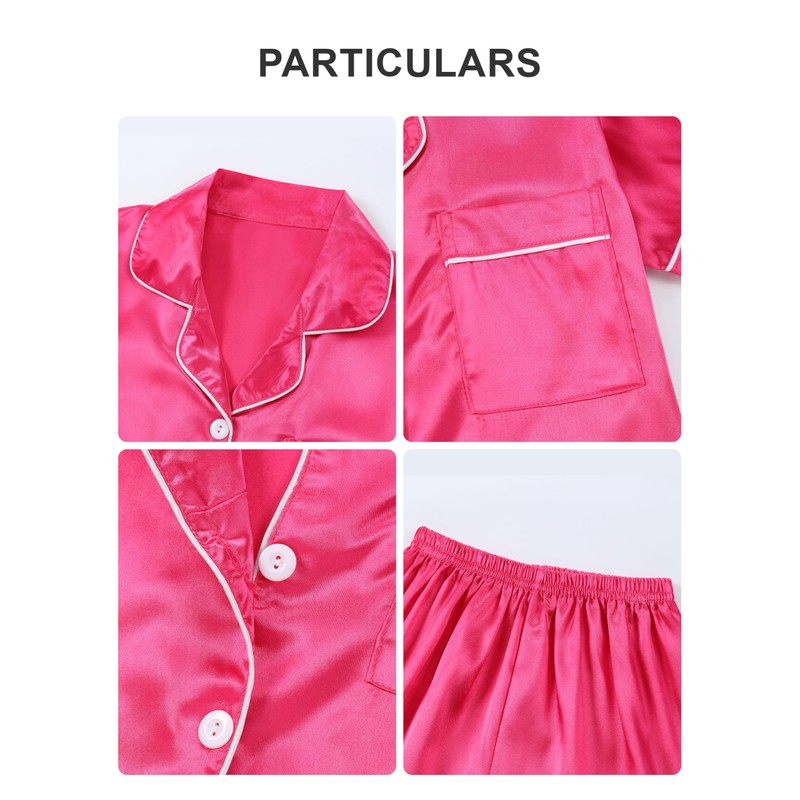 - Three-piece pajama set: Crafted from soft satin-like material, this set includes a short-sleeved top, shorts, and pants for year-round comfort. The top features a lapel collar, front pocket, and button closure, while the shorts and pants have elastic waistbands for a snug fit. The silky fabric offers a luxurious feel, ensuring a cozy, restful night's sleep for your child.