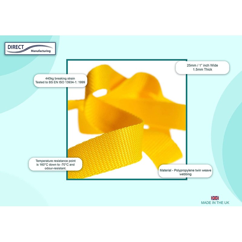 Direct Manufacturing 25mm x 50m Webbing Roll Polypropylene for DIY, Straps, Harnesses, Lashing and more | 970lb / 440kg breaking strain | Made in UK (Yellow)