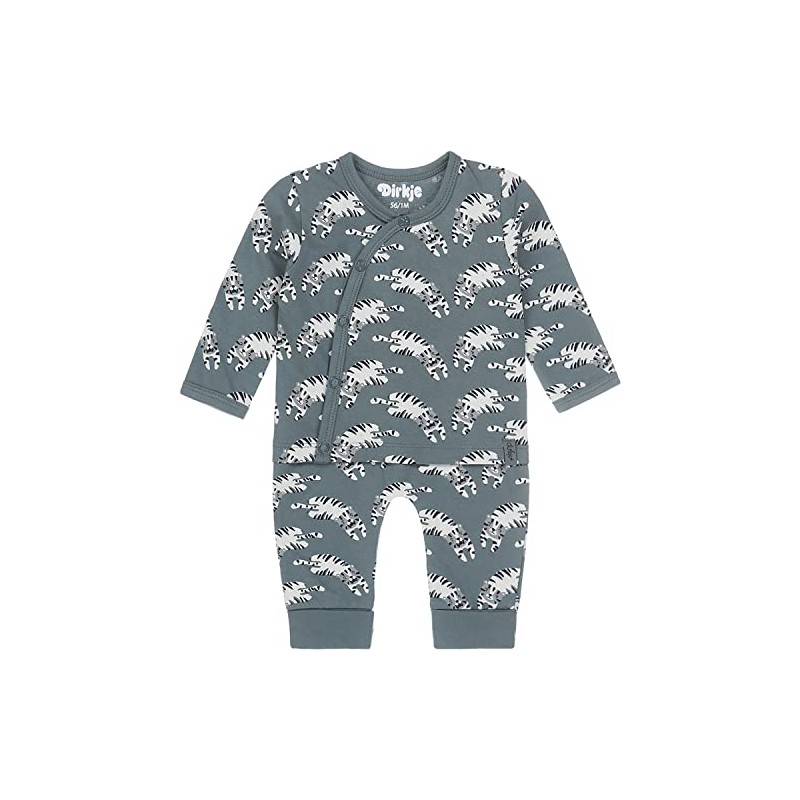 - BABY SUIT This Dirkje 2 piece baby suit is made of soft organic cotton in dusty green with a print of white tigers. The long sleeve features asymmetrical snap closures and the pants have a cuff in a simple green fabric.