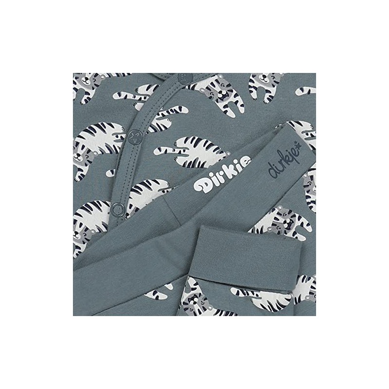 - Baby suit: This 2-piece Dirkje babysuit is made of soft organic cotton in dusty green with a print of white tigers. The longsleeve has asymmetric snap fasteners and the pants have a cuffing in a plain green fabric.