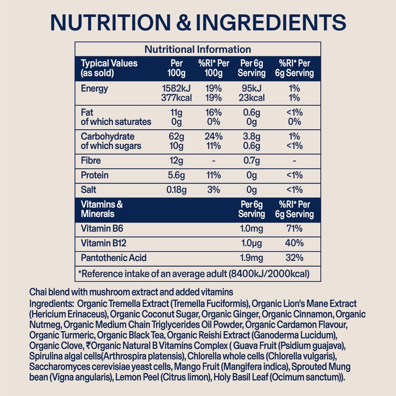 Product descriptionDIRTEA Chai is a bold, functional blend of chai spices and functional mushrooms, thoughtfully curated and consciously made, it's designed to bring focus, balance, and calm to your day. Infused with Lion's Mane for cognitive clarity, Tremella for skin hydration, and Reishi for tranquillity, this richly spiced brew supports your mind and body with functional wellness. DIRTEA Chai delivers 2,400mg of functional mushrooms per serving and is fortified with an organic B vitamin complex, including B6, B12 and B5 to support psychological function, the nervous system, boost energy levels and reduce tiredness and fatigue. Simply add hot water, stir, and enjoy a cup of this spicy warming blend.IngredientsBlack Tea 0.2g Contains small amounts of caffeine for steady energy, and is rich in antioxidants, supporting overall health and wellness. Lion's Mane 1,100mg A dual-extracted, 100% fruiting body mushroom extract, high in hericenones and erinacines, supporting cognitive clarity, memory, and focus. Tremella 1,100mg A dual-extracted, 100% fruiting body mushroom extract, rich in polysaccharides, particularly beta-glucans, that help retain moisture in the skin, contributing to a plump and youthful complexion. Reishi 200mg A dual-extracted, 100% fruiting body mushroom extract, known as the "mushroom of immortality." High in active compounds including polysaccharides and triterpenoids which support immune function. Ginger 0.6g A warming spice that aids digestion, boosts immune health, and has anti-inflammatory properties, providing both flavour and health benefits. Cinnamon 0.5g Known for its antioxidant properties and ability to regulate blood sugar, cinnamon also adds a sweet-spicy depth to the blend. Nutmeg 0.5g A warming spice with a nutty, sweet flavour, nutmeg is also known for its ability to promote relaxation and help relieve stress. Cardamom 0.25g This spice helps in detoxification, aids digestion, and contributes to the chai's rich and complex flavour. Turmeric 0.25g A potent anti-inflammatory root known for its immune-boosting and antioxidant properties, adding an earthy, warming undertone to the blend. Clove 0.1g A strong spice with antimicrobial properties, clove adds a robust and spicy kick while supporting immunity and digestion. Coconut Sugar 0.65g A natural sweetener with a lower glycemic index than refined sugar, helping to provide balanced sweetness without spiking blood sugar levels.DirectionsAdd hot water and stirSafety WarningMay affect individual responses. Consult a healthcare professional before use if you are pregnant, nursing, have a medical condition, or are taking any medication.