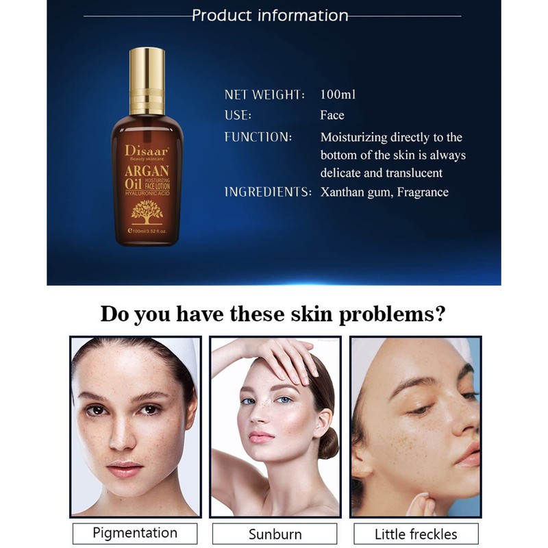DISAAR Beauty Argan Oil Moisturizing Face Lotion Hyaluronic Acid Anti-Aging Shrink Pores 100ml/3.52fl.oz