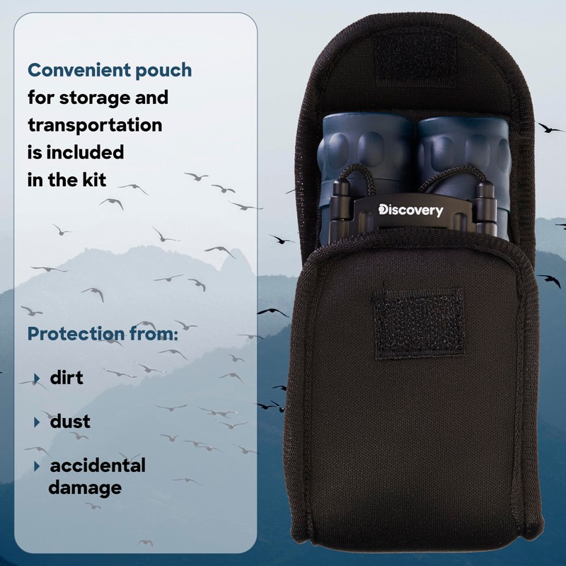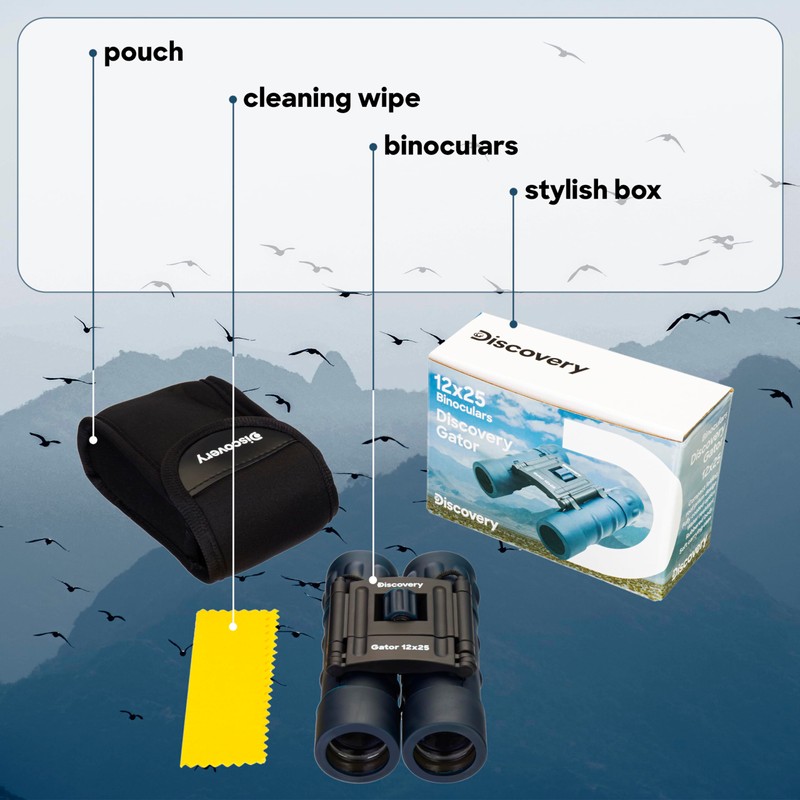 The powerful yet compact Discovery Gator 12x25 allows you to observe the world around you. The 12x magnification is enough to observe buildings and animals, even when they are far away. That's why these binoculars are a good choice for nature lovers and wildlife watching. The Discovery Gator 12x25 binoculars are easy to take with you when travelling to discover the beauty of the world around you. The optical devices are based on roof prisms, which is why these binoculars are so compact. The coating of all optical surfaces ensures a clear and sharp image. The central focusing drum is used to adjust the sharpness, and the diopter adjustment of the eyepiece as well as the eye relief can also be adjusted.