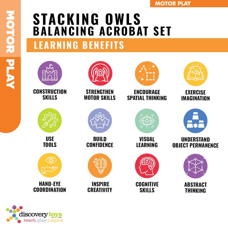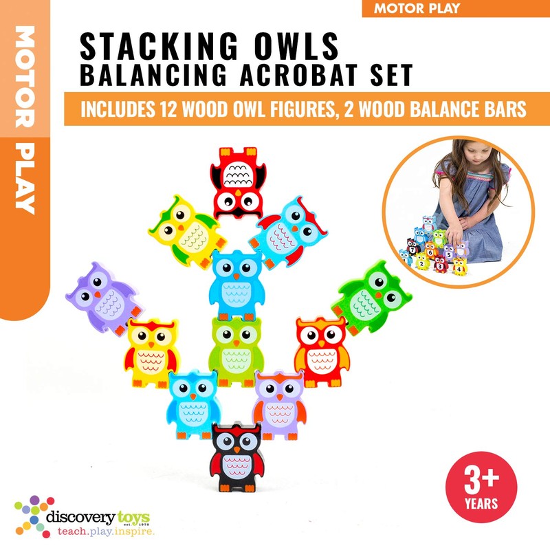 - ππππππ ππππππ ππππππ β Includes 12 wood owl figures, 2 wood balance bars, activity guide. Chunky design provides for early success by younger stackers. The owls are numbered 1-12 on one side for sequential stacking or simple number fun