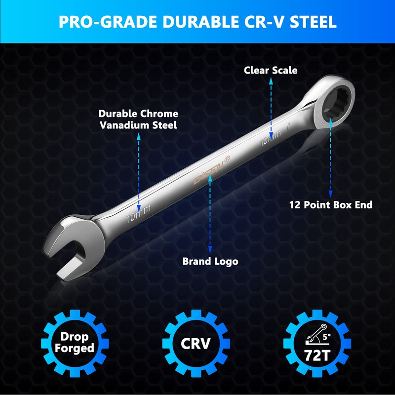 - 【Premium Material】DISEN Ratcheting Wrenches Set are made of premium quality heat treated chrome vanadium steel with mirror surface polish for anti-corrosion and rust prevention, strong and extremely durable. 10-piece wrench set with metric & sae makes emergency repairs a breeze