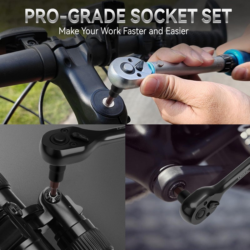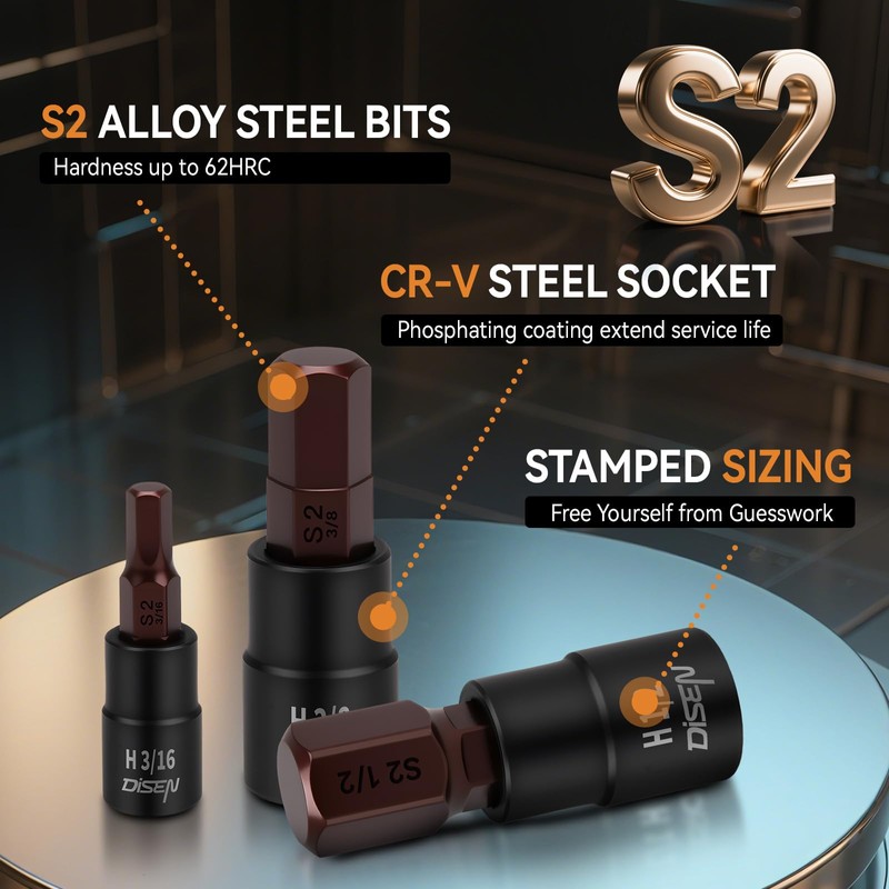 - 【Premium Material】DISEN 32PC Hex Bit Socket Set are made of premium heat treated Chrome Vanadium Steel with a black phosphate finish on torx socket end and heat treated S2 Alloy Steel on hex bits, a high quality material with high durability and maximum strength, and provide greater torque. Chrome plated on the surface for anti-corrosion and rust prevention
