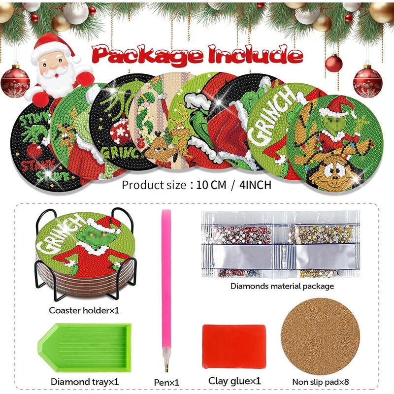 - Package Includes: You will receive 8 christmas diamond art coasters , 8 cork mats, 1 coaster holder, enough colored diamonds, 1 clay glue, 1 pen and 1 diamond tray