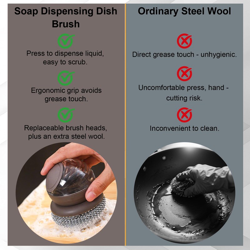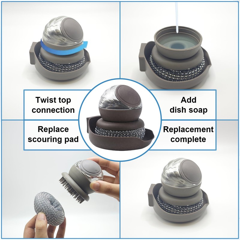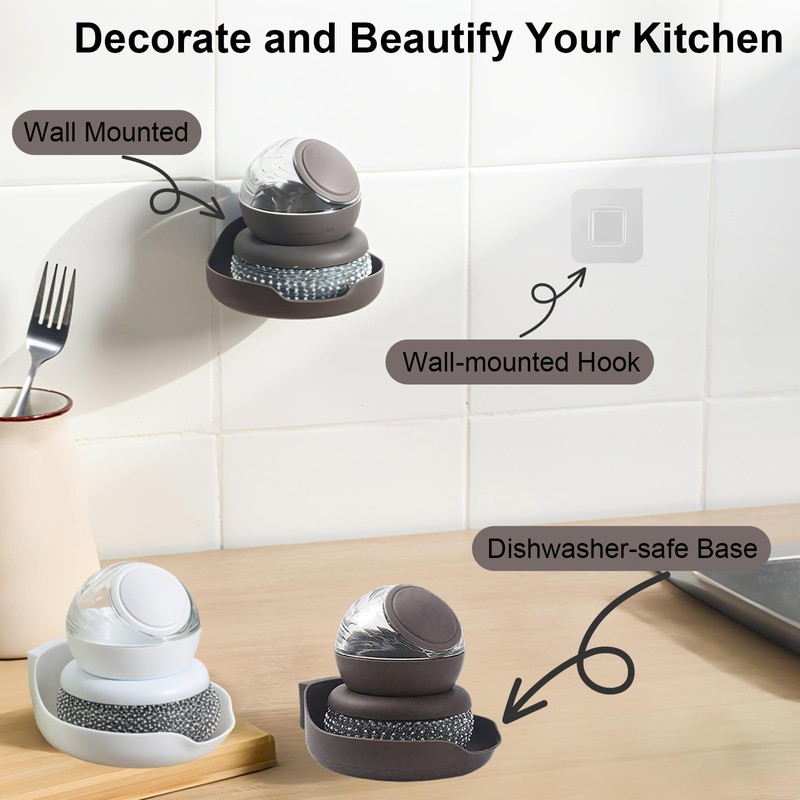 - Wall-mounted Design: Our dishwashing brush boasts a sleek, modern design. Soap dispensing dish brush comes with a base that lets you store the used brush to keep your kitchen tidy. You can even hang the base on the wall to save counter space and add a stylish touch to your kitchen. Our wire dishwashing rag conforms to the ergonomic design. The grip fits the curve of your palm perfectly, providing a comfortable and non-slip holding experience. The unique cleaning handle effectively isolates food grease and cleaning agents, protecting your hands.