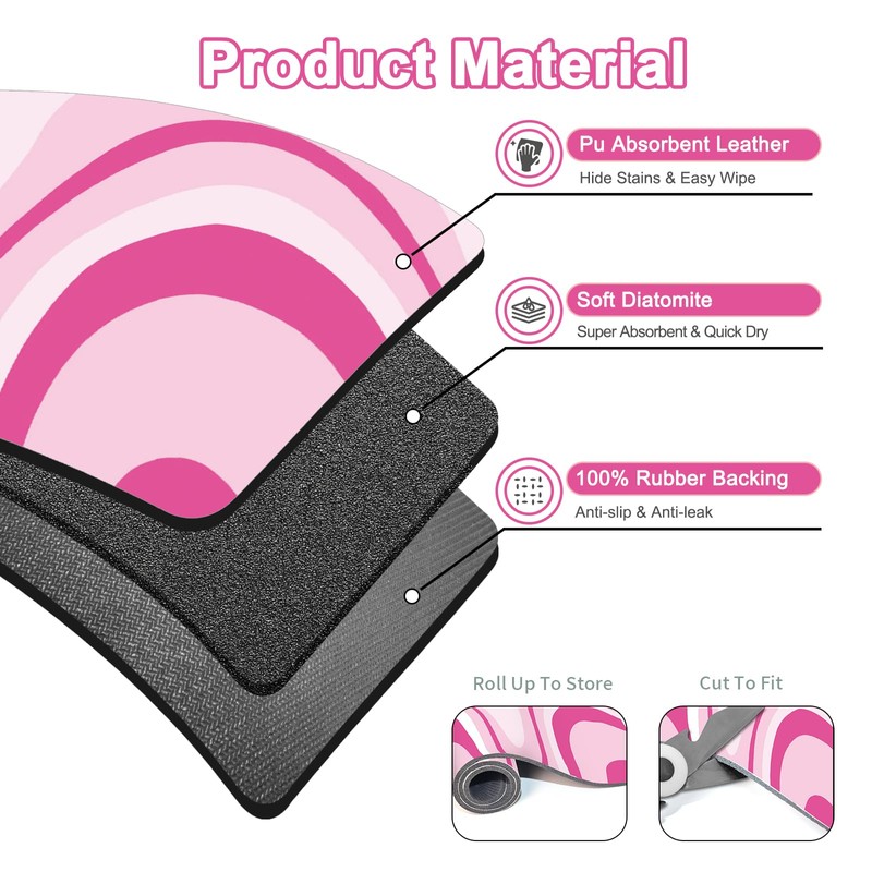 Dish Drying Mat for Kitchen Counter, 12" X 20" Absorbent Coffee Bar Mat Rubber Backing, Easy to Clean Kitchen Drying Matt for Dishes, Utensils, Countertops, Pink Abstract