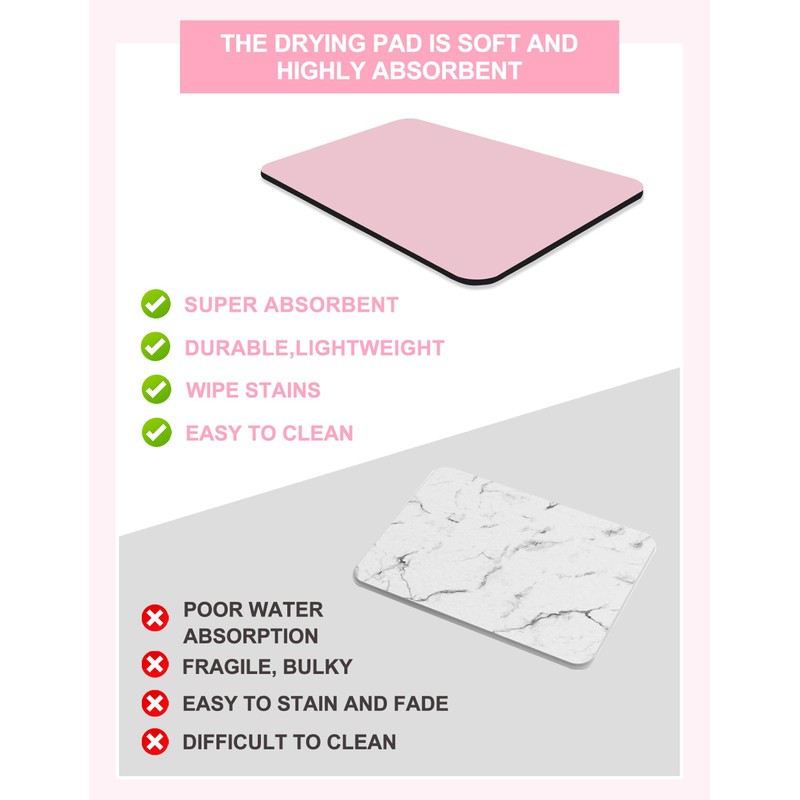 - Super Absorbent: Dish Drying Pad is made of super absorbent nano, the drying pad is soft and highly absorbent, which can dry quickly. In addition, the drying mat is thick enough to better protect countertops, tableware, and glassware from damage and contamination.