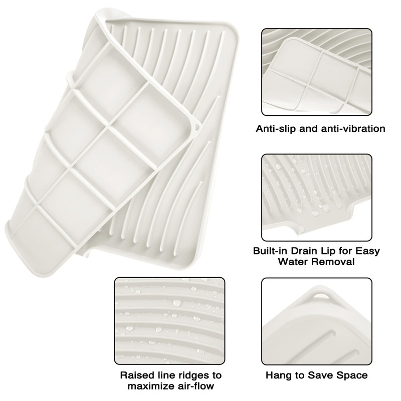 - NON-SLIP AND HEAT RESISTANT: This silicone dish drying mat offers excellent non-slip functionality, preventing plates, fruits, and glassware from sliding off. With a heat resistance of up to 450°F (230°C), it protects your countertops from hot pots and appliances, making it an ideal kitchen accessory for any home.
