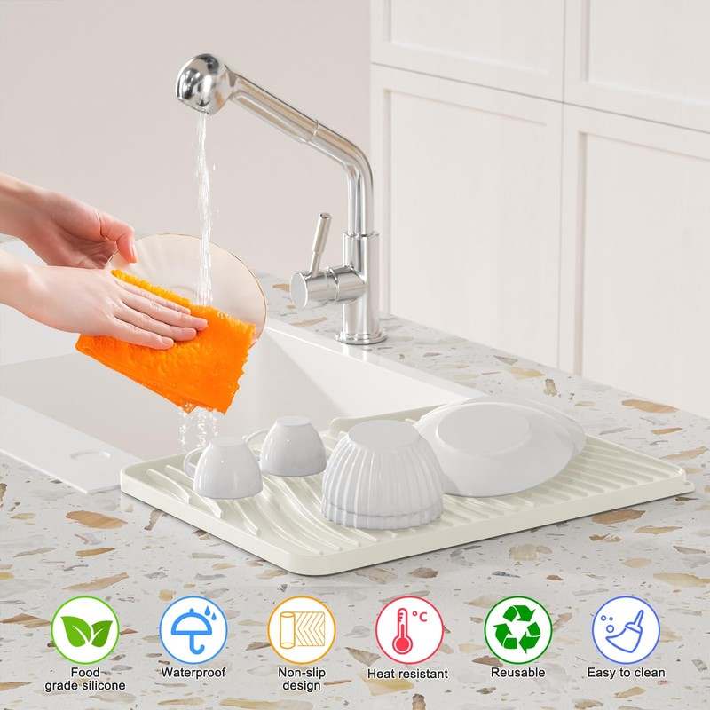 - FOOD-GRADE SILICONE MATERIAL: Made from environmentally friendly food-grade silicone, this drying mat is BPA-free, durable, soft, and easy to clean. It retains its shape and provides a hygienic surface for your dishes, ensuring a cleaner and healthier kitchen environment every time you wash up.