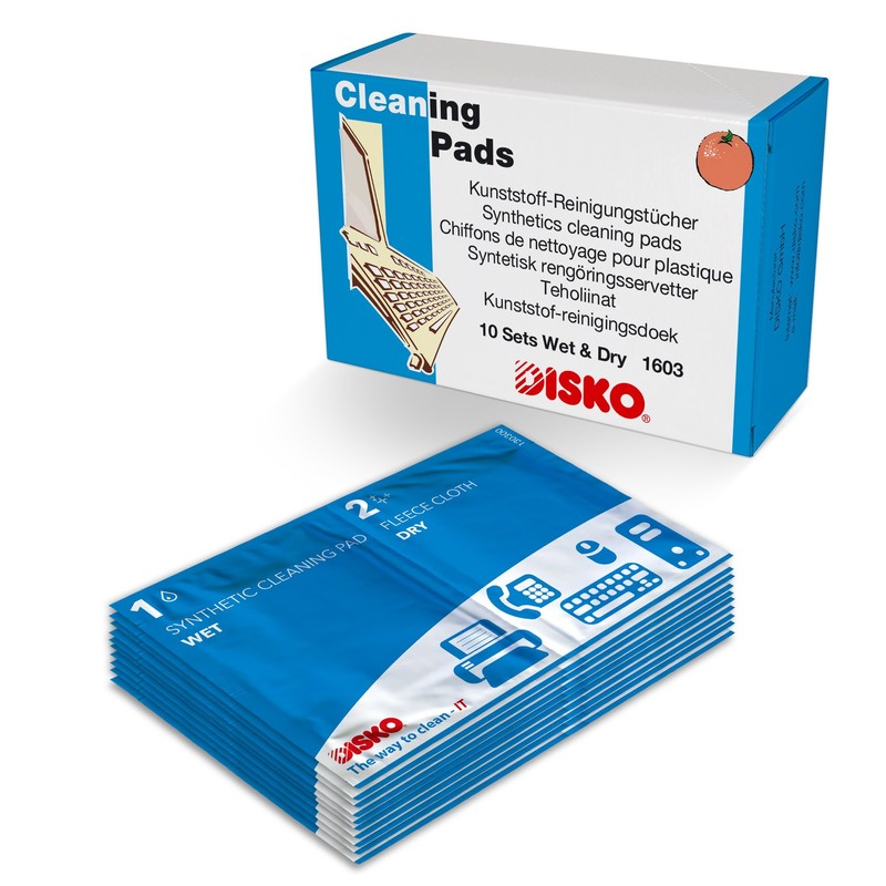 - Disko plastic cleaning cloths for all surfaces made of plastic, keyboards, painted metals, cables, etc.