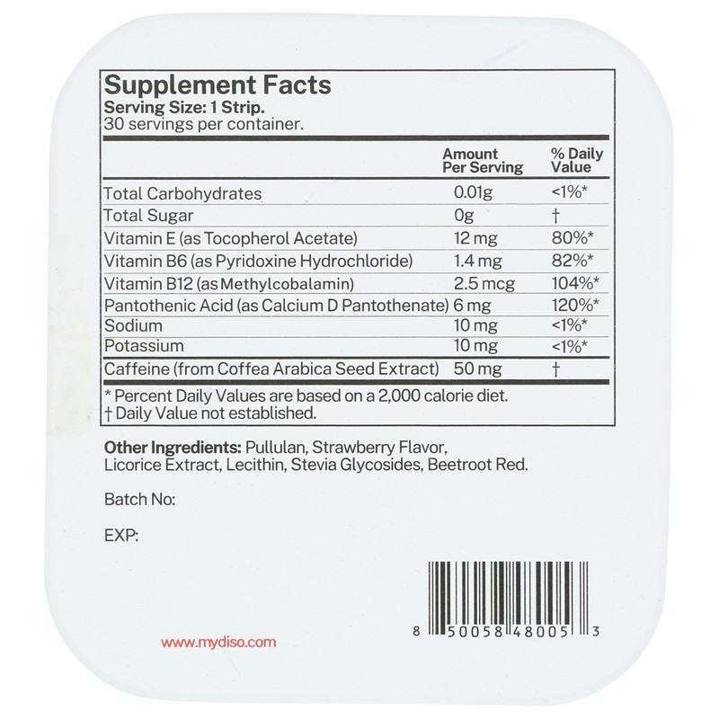 DISO - Energy - Dissolvable Caffeine Strips with Vitamins, Strawberry Flavor, Vegan, Sugar Free, High Absorption, Gluten Free, Individually Wrapped, 30 Count