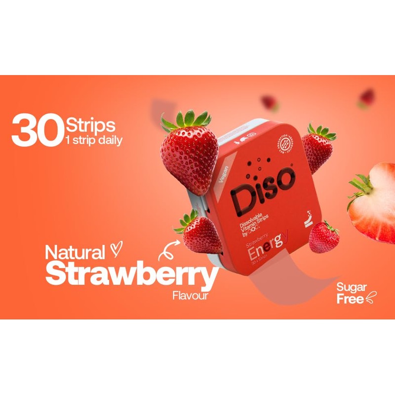 - PRACTICAL PACKAGING: You never know when your energy levels are going to drop, so take your Diso out on the go with you. TANGY STRAWBERRY FLAVOR: Wake up and smell the strawberries. Look forward to your next strip with Diso Energy’s tasty flavour. HIGH ABSORPTION: Designed with Absorbatec technology, our dissolvable vitamins prioritise high absorption so you get to feel the benefits.