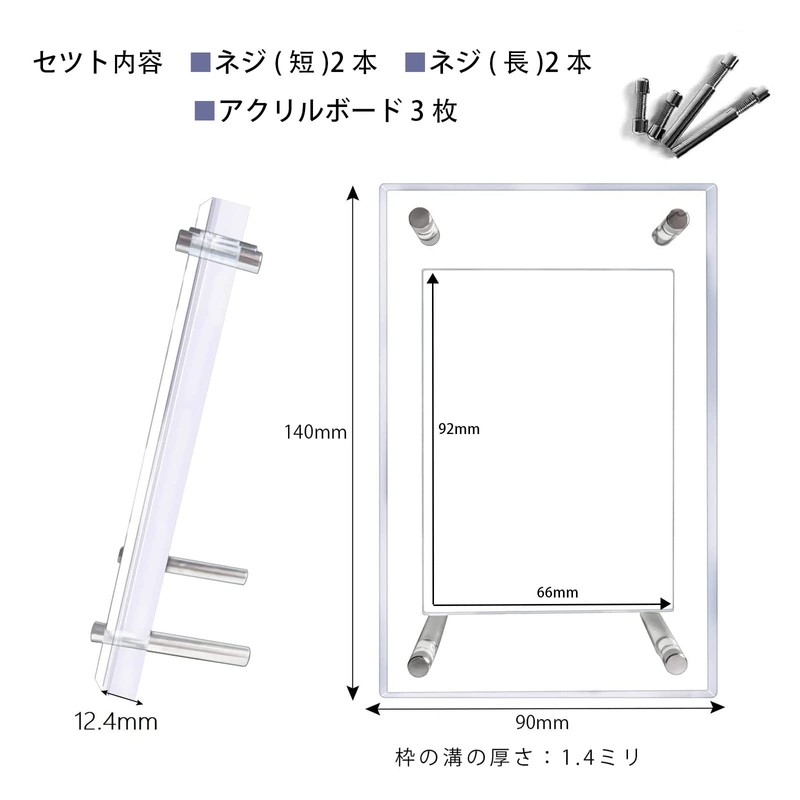 - Material: 1. Display (W x H x D): 3.5 x 5.5 inches (90 x 140 mm); Acrylic Thickness: Surface Plate 0.1 inches (4 x 2 mm); Back Plate 0.3 inches (8 x 14 mm); Card Frame (W x H x D): 2.6 inches (66 x 92 mm); Slot Thickness: 0.08 inches (2 mm)