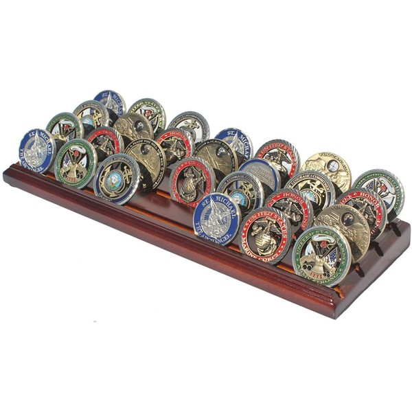 DisplayGifts Challenge Coin Display Stand 4 Row Wooden Holder Rack Case Holds 28 Coins Walnut Finish