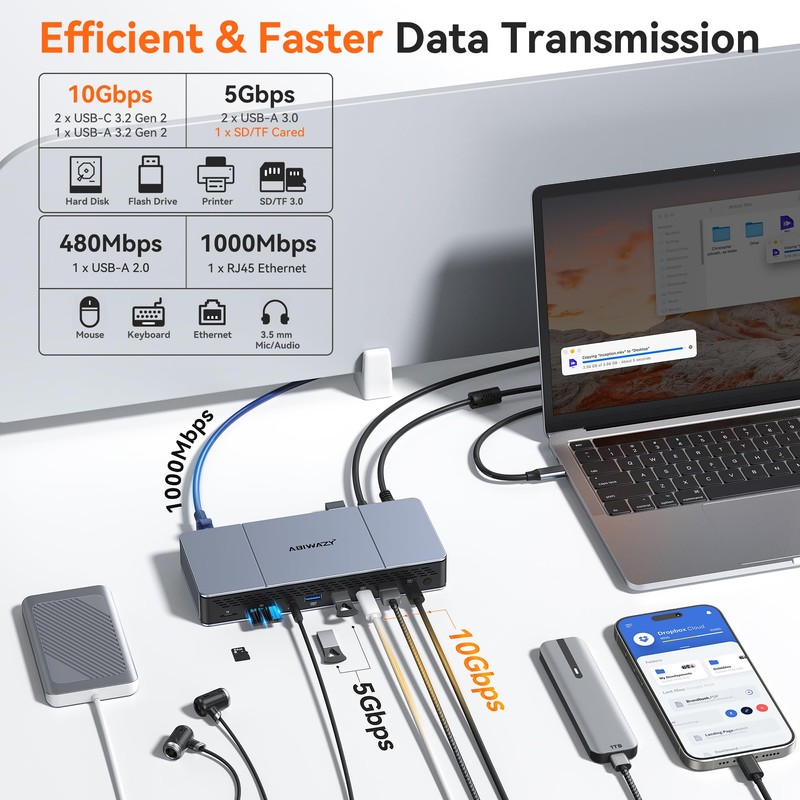 - DisplayLink Docking Station 18 IN 1 for Macbook M1/M2/M3:ABIWAZY's displaylink dock with 140W power adapter expand 18 ports for daily use: 3*4K HDMI+2*4K DisplayPort+Button(ONLY Turn off the screen)+100W USB-C PD(Max)+140W DC power charging port+10Gbps USB C 3.2 Gen1 port(data & 30w output)+ Gigabit Ethernet+10Gbps USB C/A 3.2 Gen1 port(only data)+ 2*USB A 3.0+ USB A 2.0+MicroSD/TF card slots+3.5mm Audio&Mic Jack.★Note: The dock must connect the 140W DC power adapter, otherwise it will not work