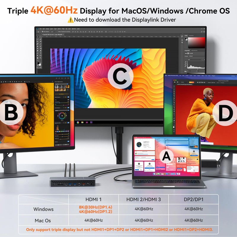 - Triple/Dual 4K@60Hz Display Monitors Docking Station: The laptop docking station 3 monitors with 3 HDMI+2 DisplayPort by installing the DisplayLink driver, your MacBook is not limited by the M1/M2/M3/M4 chip, easily enjoy various multi display and up to triple 4K@60Hz display. HDMI1 of the display link adapter max up to 8K@30Hz/4K@120Hz when used alone (only under DP1.4 on Windows), other video output ports must download the displaylink driver to work. Note: Your laptop must support video output