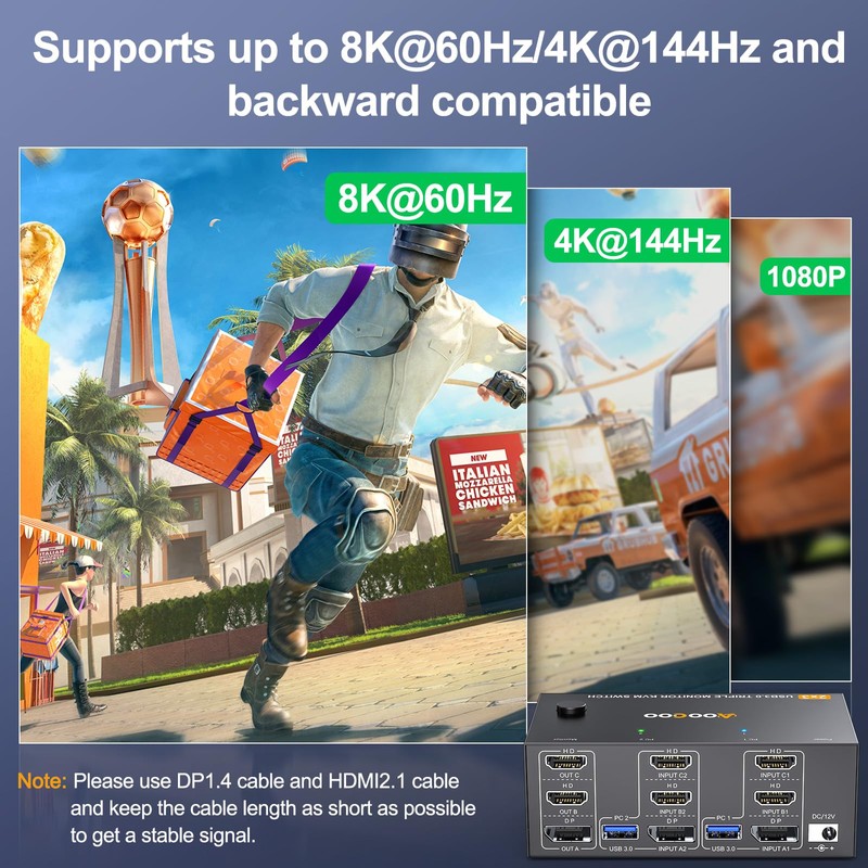 • 【8K@60Hz/4K@144Hz Triple Monitore KVM】Die Auflösung und frische Rate von 3 Monitoren KVM Switch unterstützt bis zu 8K@60Hz/4K@144Hz. ▲▲▲Note :①HDMI unterstützt 8K@60Hz,4K@120Hz,und abwärtskompatibel.②Displayport unterstützt 8K@30Hz ,4K@144Hz und abwärtskompatibel.✔✔✔Warming: Bitte verwenden Sie HDMI2.1 und DP1.4 Kabel, wenn die eingestellte Entfernung es erlaubt, die Länge der Kabel mehr kurz mehr besser.