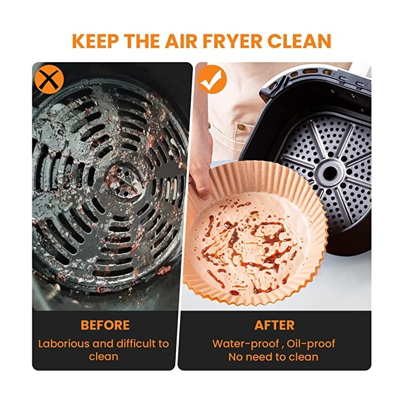 - 【Easy to Clean】These air fryer paper liners can effectively keep the food residue away from your air fryer, Its heightened edge of 1.78in can protect the side of fryers and prevent food from sticking to them, making air fryer as clean as unused, saving you time.
