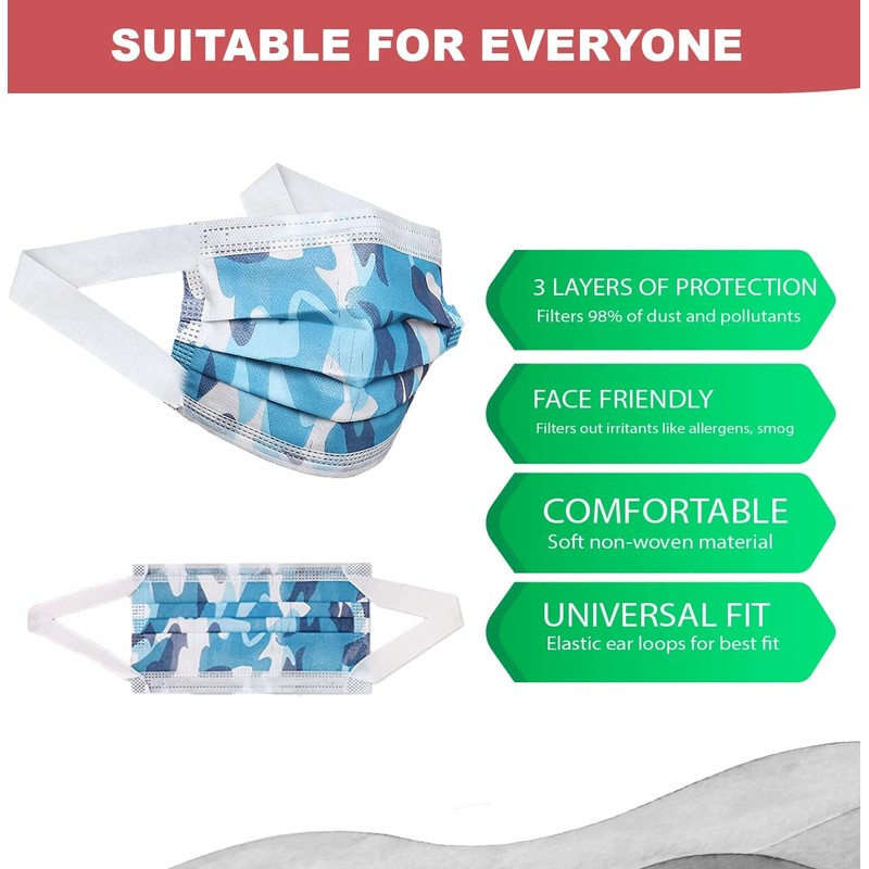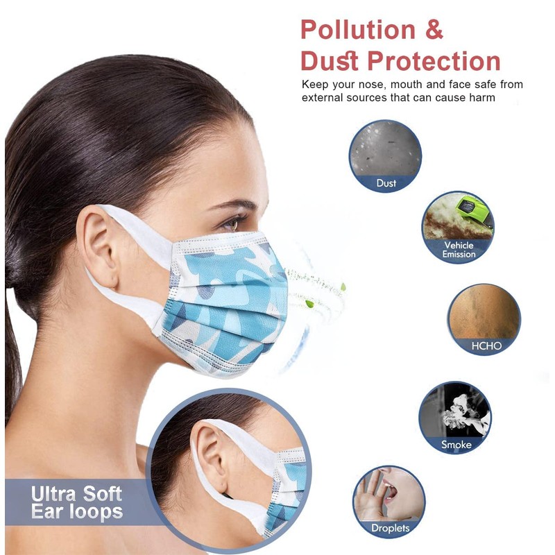 Disposable Face Masks 3 Ply With Ultra Soft Ear Loops - Beautifully Printed Single Use Breathable Protection Masks (100 Count (Pack of 1), Camouflage Blue)